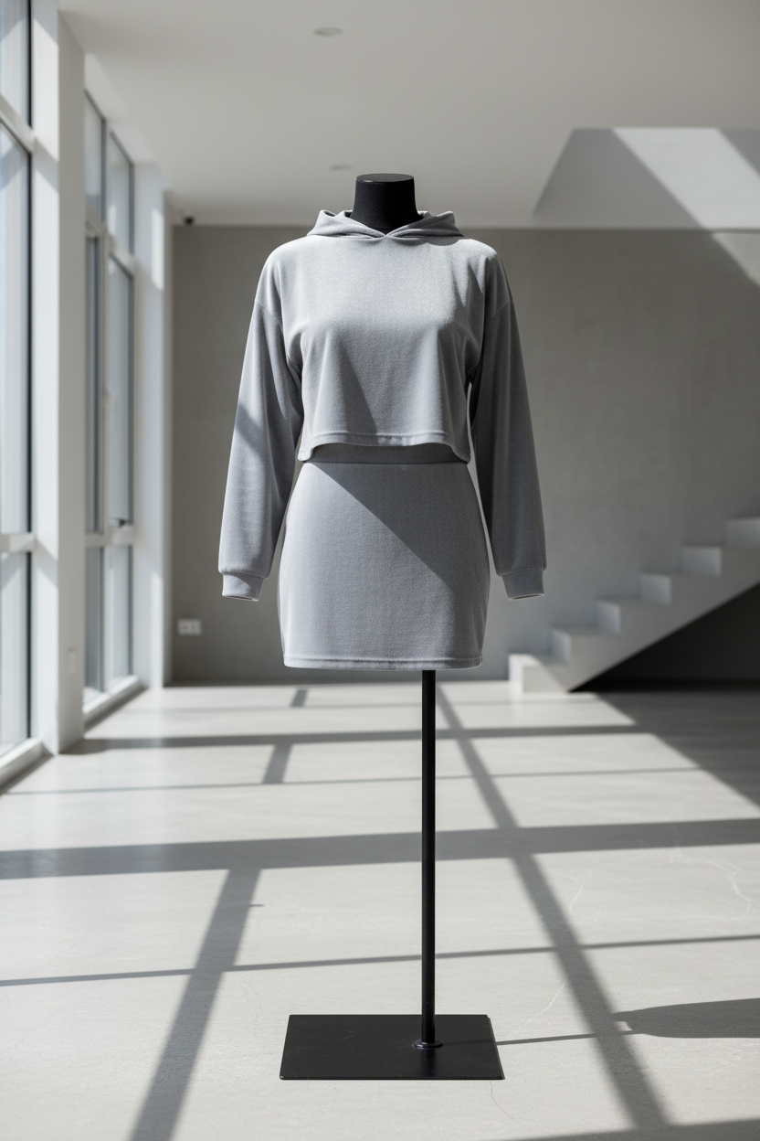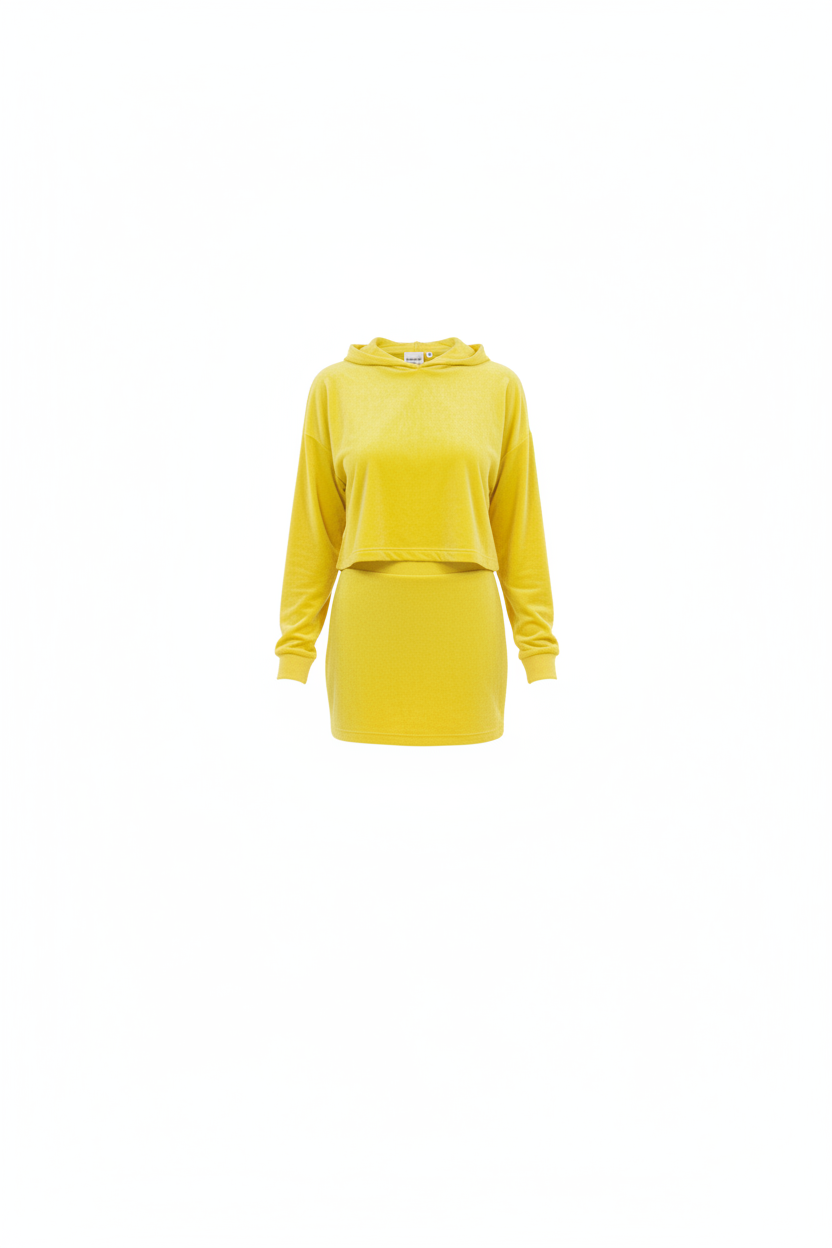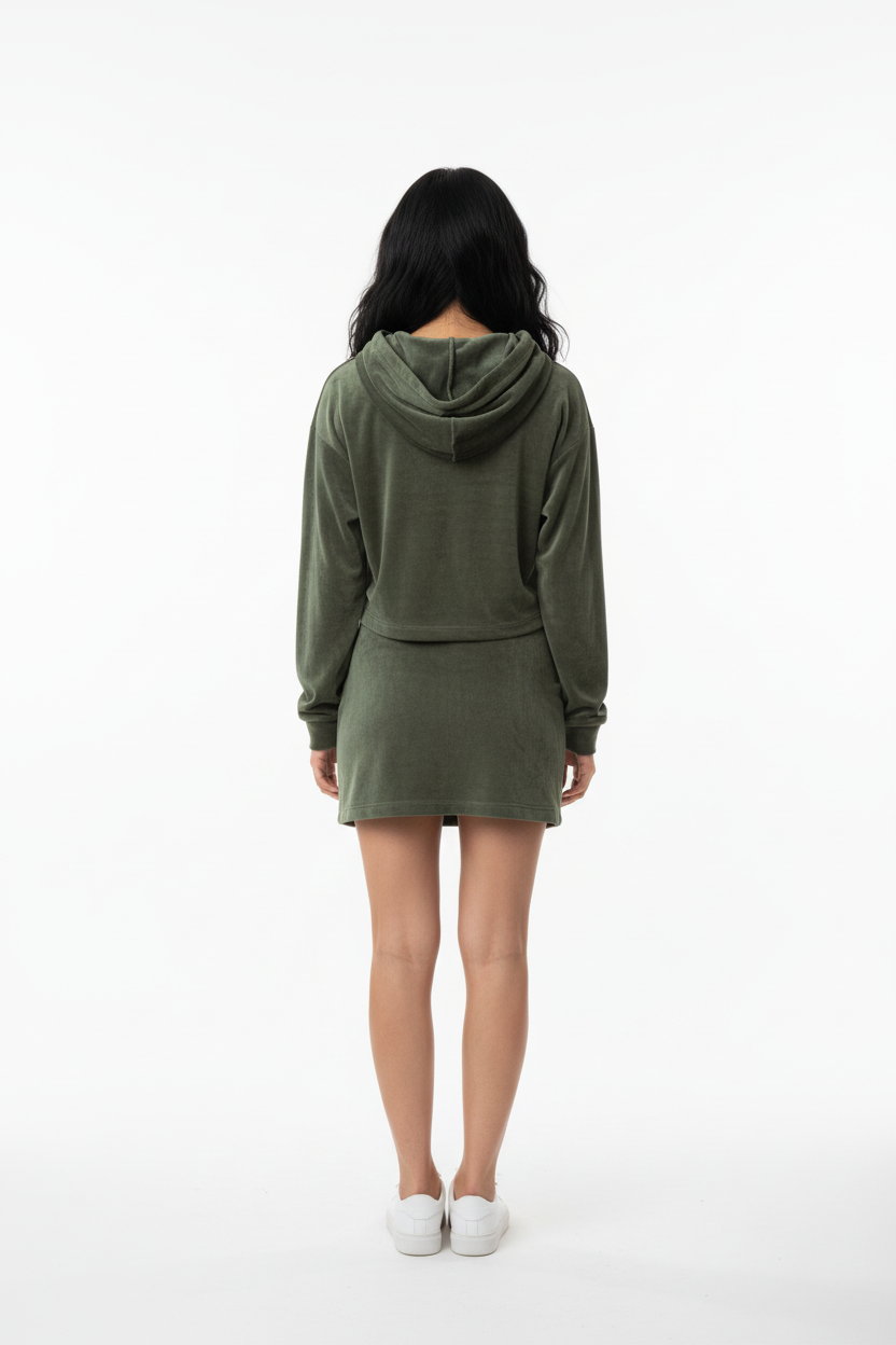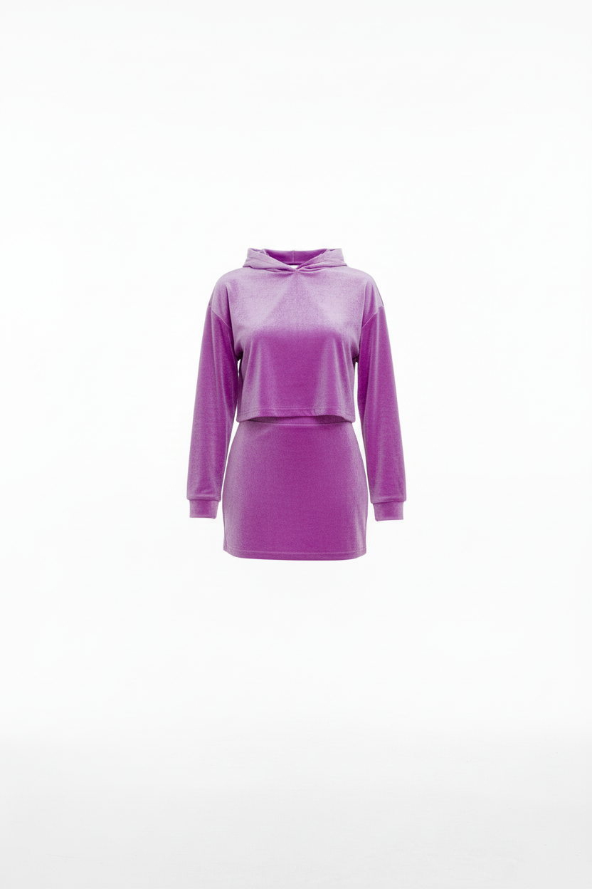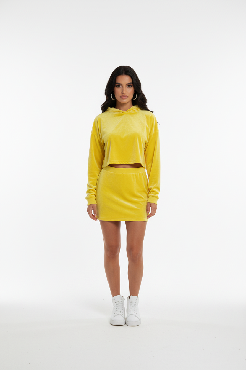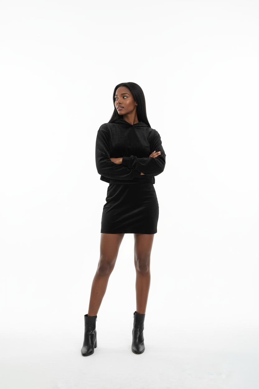 The Amari BOXXEE set features a cropped hoodie with oversized sleek crop top hoodie and a figure-flattering mini skirt. Both pieces are crafted from premium velvet fabric that catches the light beautifully while maintaining an ultra-soft, luxurious feel against your skin.