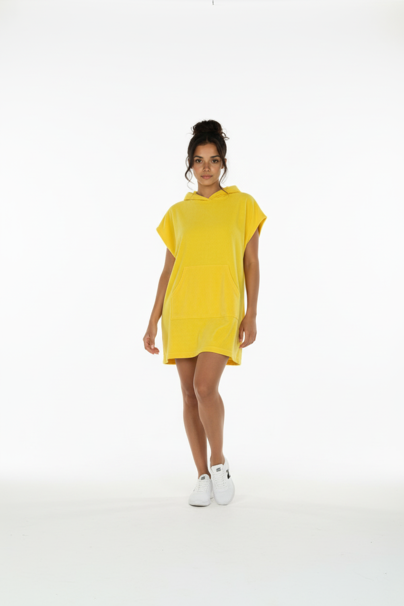 Hoodie/ dress in yellow crushed velvet with front pocket
