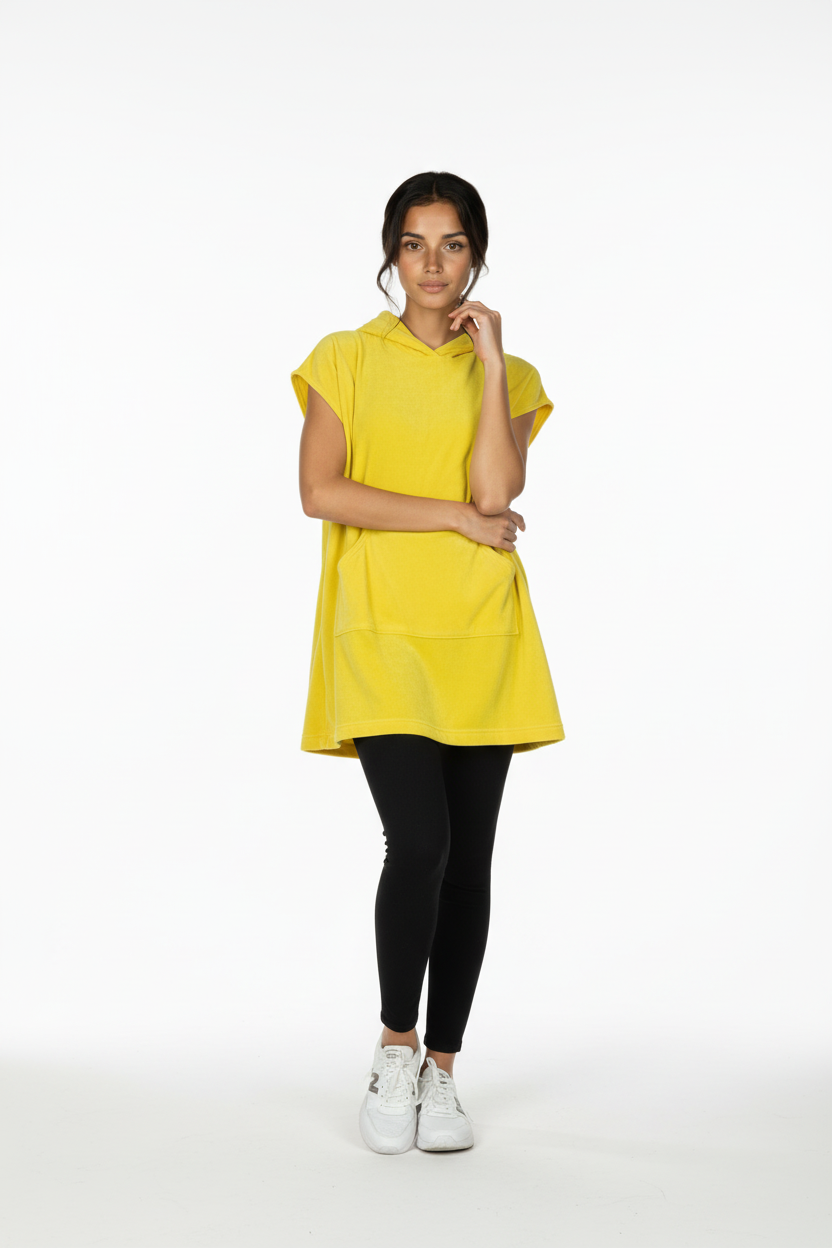 This high end hoodie/dress in in yellow crushed velvet with front kangaroo pocket is a sleeveless perfection for you to be comfortable and stylish. The hoodie futures generously sized hood which gives it luxurious yet sporty look. The colour will make you stand out from the crowd and feel unique.