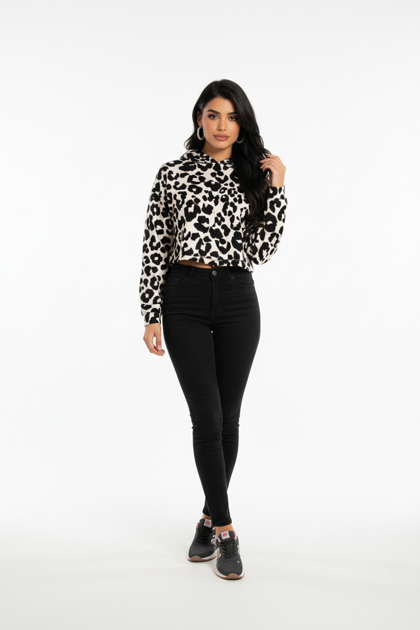 This cropped top hoodie with bold black and beige leopard print pattern is ideal if you want to stand out of the crowd. Stylish but comfortable, super cool.
